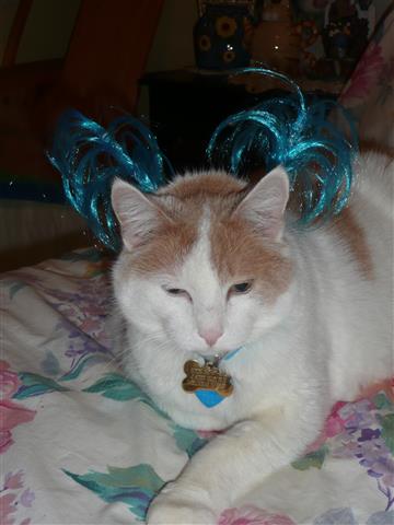 My adorable kitty Boxer wearing aqua pigtails headband. |